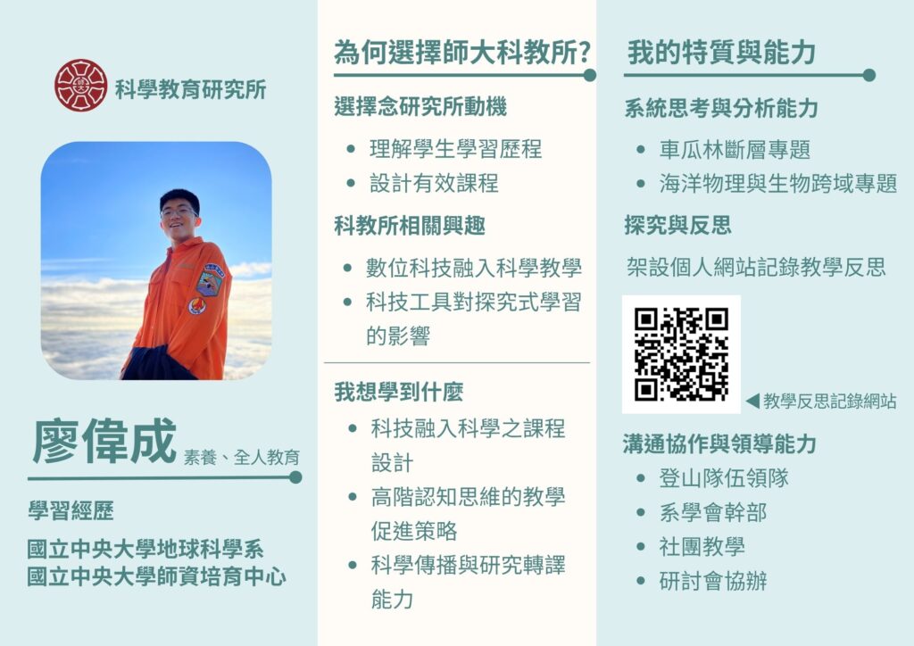 今年暑假,我開始思考自己到底要申請哪間研究所,最初申請的動機,是因為教材教法的逸年老師鼓勵我們,如果要當老師的話,建議可以念個研究所,整體來說CP值很高。事實上,我一直都在思考到底該念本科地科研究所還是教育研究所,後來下了這個決定,是因為確認自己對地科真的沒那麼有興趣,之前也做過專題,只是短短2個月我就快受不了了,很慶幸我不需要顧慮家裡的經濟,只要照顧好自己就好了,於是抱著試過才知道的想法,開始著手查詢有哪些研究所適合自己,最後在學長姊的建議下,決定以師大科教所為主、中央學習所為輔申請。這篇主要說明師大科教所的面試流程與心得,備審資料的準備我會再撰寫另一篇文章統整。
